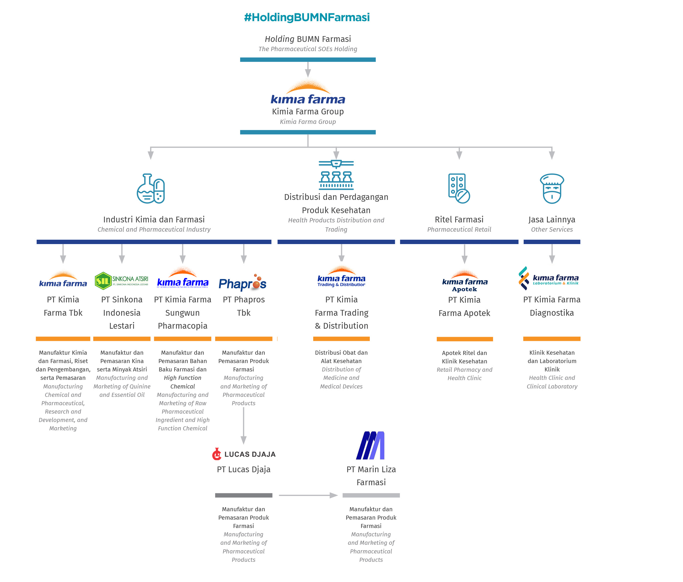Melalui sinergi dengan kelompok usaha, Grup Kimia Farma berupaya menghadirkan produk dan layanan bermutu. Di samping itu, sinergi dalam Holding BUMN Farmasi memperkuat fokus bisnis Kimia Farma, dan menjadi fondasi yang kokoh bagi pertumbuhan di masa datang.