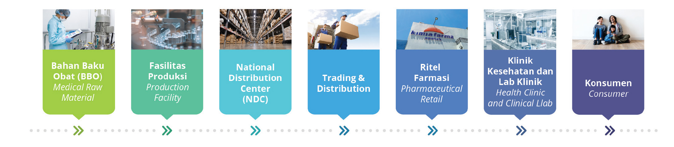Kimia Farma memiliki jaringan layanan kesehatan yang terintegrasi di 34 provinsi di Indonesia. Hal ini memperkuat posisi Kimia Farma sebagai perusahaan healthcare dari hulu ke hilir (end-to-end). Dilengkapi dengan 10 fasilitas produksi, 49 distributor, lebih dari 1000 layanan ritel (apotek), klinik kesehatan, klinik kecantikan dan lebih dari 70 laboratorium klinik, Kimia Farma menjaga ketahanan kesehatan nasional dari waktu ke waktu.